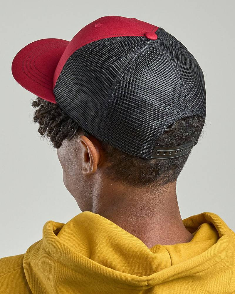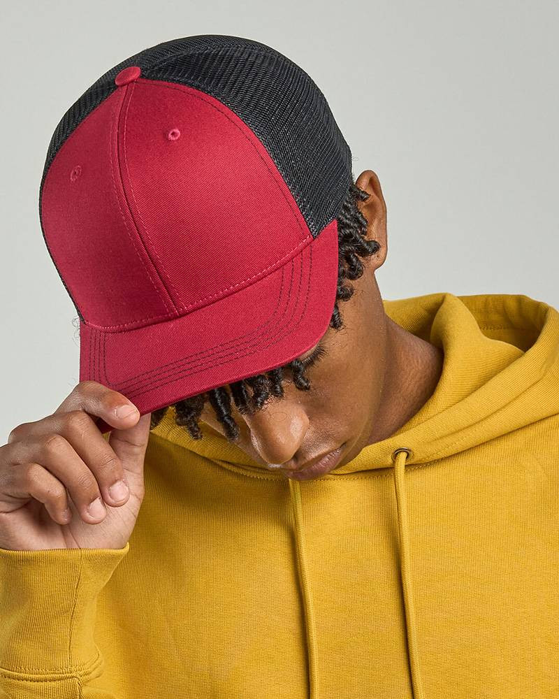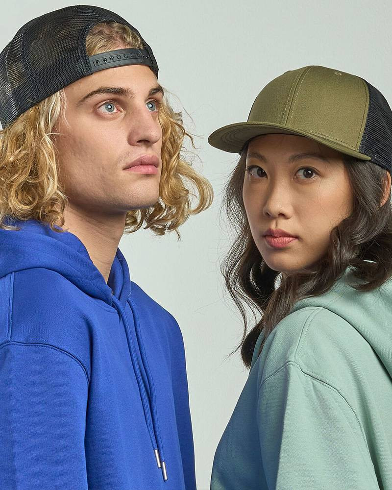 Cappellino trucker SONIC-S con struttura a 6 pannelli realizzato con un mix di cotone riciclato e organico; tessuto principale 80% cotone organico 20% cotone riciclato, lato e retro 100% poliestere riciclato, gr.280 mq Presenta una visiera mid, una chiusura snapback riciclata e mesh traspirante in poliestere riciclato, visiera precurvata e occhielli ricamati, chiusura in PVC, 4 cuciture sulla visiera, rete posteriore traspirante in poliestere riciclato, etichetta removibile.