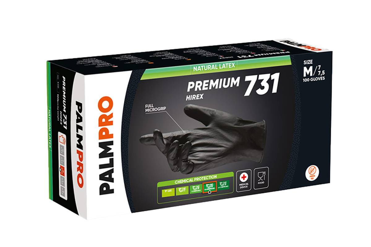Guanto monouso ESB – PALMPRO PREMIUM 731 HIREX - LATTICE DI GOMMA NATURALE di colore nero, ambidestro con bordino senza polvere. Elevata biocompatibilità, a ridottissimo contenuto proteico (<50 µg/g), ambidestro con bordino. Ottima sensibilità, destrezza e comfort. Eccellente elasticità anche a basse temperature. Migliorata resistenza chimica a detergenti e detersivi diluiti ed a soluzioni acquose di composti in genere. Packaging vendita dispenser box con 100 guanti.