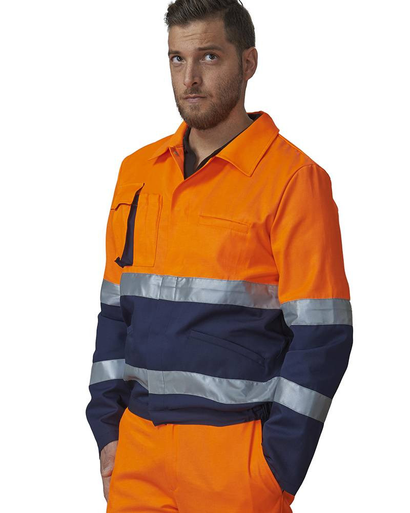 Giubbino bicolore arancio/blu art.69GB0484-9016 in tessuto 60% cotone 40% poliestere 250 gr/mq finissaggio Water Repellent. Giubbino alta visibilità, abbottonatura nascosta con bottoni a pressione, fondo manica regolabili con bottoni a pressione, elastico ai fianchi e doppio giro di banda reflex altezza torace e girovita; due tasche davanti, una tasca porta cellulare sul davanti destro, un taschino portapenne sul davanti destro, un taschino sul davanti sinistro. Massimo dei lavaggi consentiti 50.